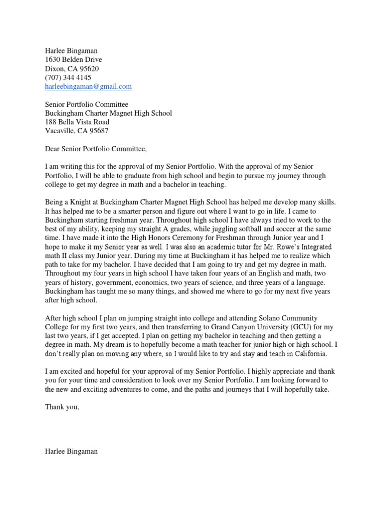 Resumes and cover letters your cover letter is a writing sample and a part of the screening process. A letter of critical reflection, addressed to the assessment reader, that discusses the contents of your portfolio. College portfolio cover letter example group who are there to help you at whatever point you require. While your letter needs to be customized to individual circumstances, this sample cover letter below can help an aspiring intern's cause. Download the teacher cover letter template (compatible with google docs and word online) or see below for more examples. Home > cover letter > cover letter examples > administrative > portfolio. Portfolios can take up to 60 days to review. I truly believe that my past experience and education would make me a valuable asset for your organization. Cover letters should be around three paragraphs long and include specific examples from your past experience that make you qualified for the position. In my portfolio you can expect to see a range of different types of writings that we have learned to write throughout the past semester. That document is a reflective cover letter wherein you introduce those revised essays—and yourself as a thoughtful writer—to your portfolio reader. Sample cover letter for a teacher. Student is provided syllabus to identify learning outcomes.