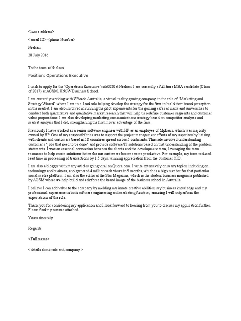 Whatever position you are thinking about you should be able to find here a sound template to build around your professional. The creativity of abc company, as shown through advertisements, and social media channels, has sparked my enthusiasm to apply for a sales executive position here. With this application letter sample, you'll learn how to maximize your chances of landing one of these highly coveted positions by highlighting your top skills and relevant experiences. You have made an executive resume and now you are all set to impress the employers by sending them your resume. I determine the overall strategic direction of product development and uphold the company's position at the forefront of technology by focusing on. Savesave hr executive position cover letter sample for later. I have been employed at oasis agency for the last three years as an administrative assistant and i fully. A strong executive cover letter is important for showing that you care enough about the position to put the effort into writing one—and it's important for the actual content of the letter itself. Two sample executive assistant cover letters: See sample executive cover letters that will get jobs. Our cover letters have been designed to give you that helping hand to advance your career ! Take a separate piece of paper and record your accomplishments, then choose three which are the most impressive, then write them up in the cover. I endeavor to join nielsen as an hr executive for which i am aware you are looking for someone with a meticulous track record in human resources and ability to work independently.